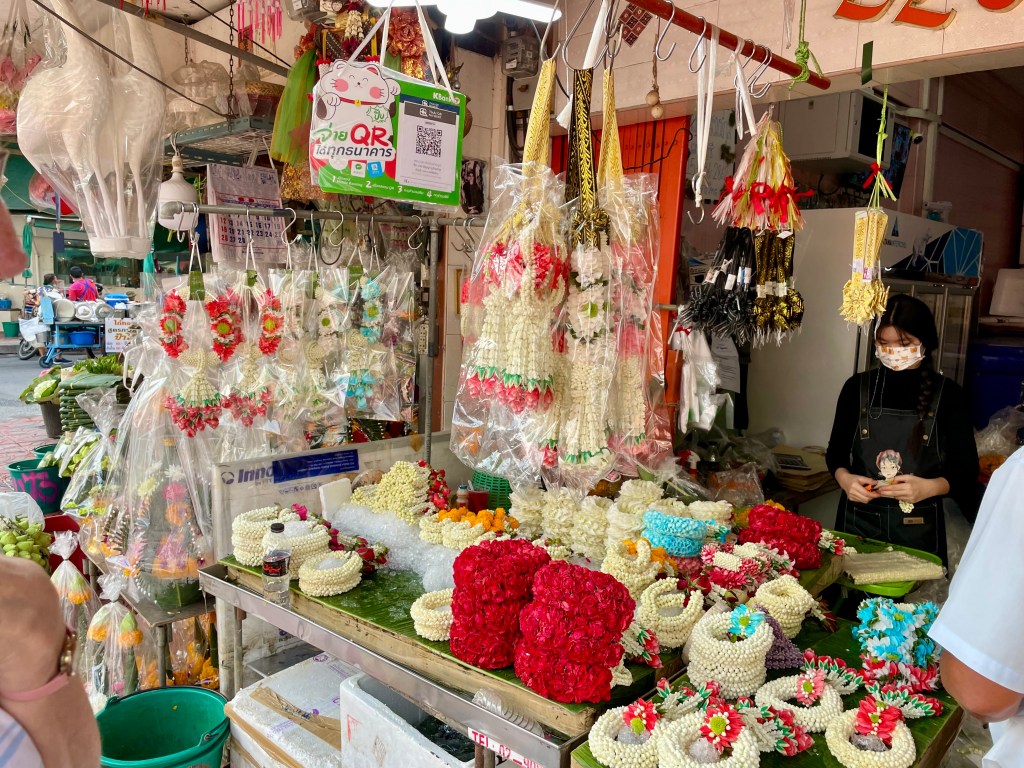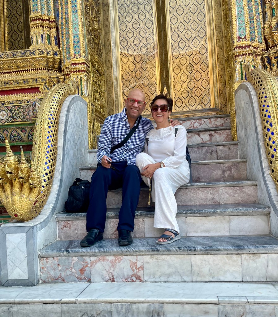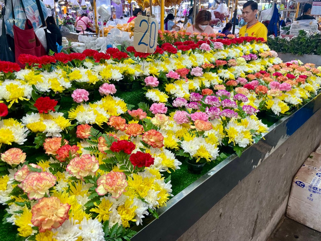 - Day trip to Bangkok; It is a long way from London to Thailand so we spent a day and an evening in Bangkok. We stayed at the Movenpick hotel at Sukhumvit 15 for one night. Superb hotel. We arrived in time to get showered and changed and enjoy ”Chocolate Hour”, which Sue thought was the perfect introduction to a holiday. Bangkok is a large city, with around 10 million people and there is so much to do. In the evening we walked around with our friends Amyn and Leila, we all had a foot massage (very welcome after a long day travelling) and ate at Terminal 21. The following day was full on, and we hired a driver to take us to various sites. Some of the places we went to include the Bangkok Flower Market (Pak Khlong Talad) which is the biggest wholesale and retail fresh flower market in Bangkok, a river/canal cruise on a Longtail Boat which gave us a glimpse into Bangkok life, a visit to Wat Arun (The Temple of Dawn) and the Grand Palace before the journey to Pattaya.