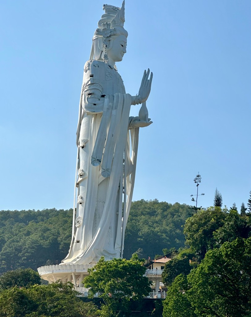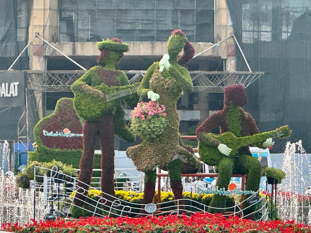 Da Lat is a city in the south of Vietnam initially developed by the French in the early 1900s as a resort destination. It has a unique climate being 1500 metres above sea level. When we arrived it was around 25 degrees Celsius, a welcome change from the mid 30s of Mui Ne that we had come from. The architecture is a mixture, some French influences remain and there are impressive European-style villas and hotels. The first thing we noticed was the dancing/ musical figures on the roundabout near the large Xuan Huong Lake, right in the centre of Da Lat. This is a spectacular vista during the day and at night is a vibrant hub for street food and markets, where you are serenaded by the sound of car/ bike horns and the fragrant smells of food being cooked.